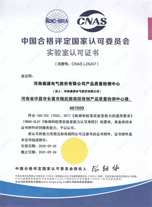 近日,河南森源电气产品质量检测中心顺利通过中国合格评定国家认可委员会(CNAS)认可,获得CNAS认可证书(注册号:CNAS L24247)。这标志着该中心在管理水平、检测能力与技术实力等方面已达到国家及国际标准化水平,其检测报告获全球范围内与CNAS互认国家和地区认可,具备高度权威性与公信力。